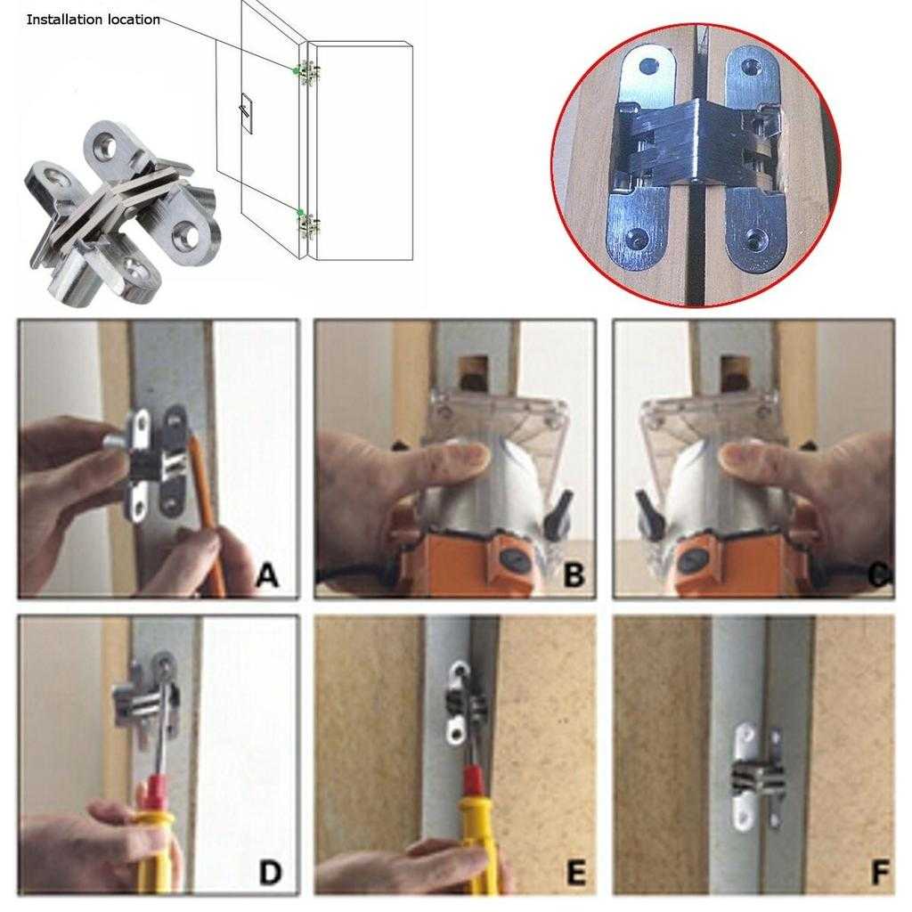 Процесс установки скрытых петель на металлические и деревянные двери практически одинаков: необходимо вырезать выемку нужного размера, вставить в нее механизм и закрепить.