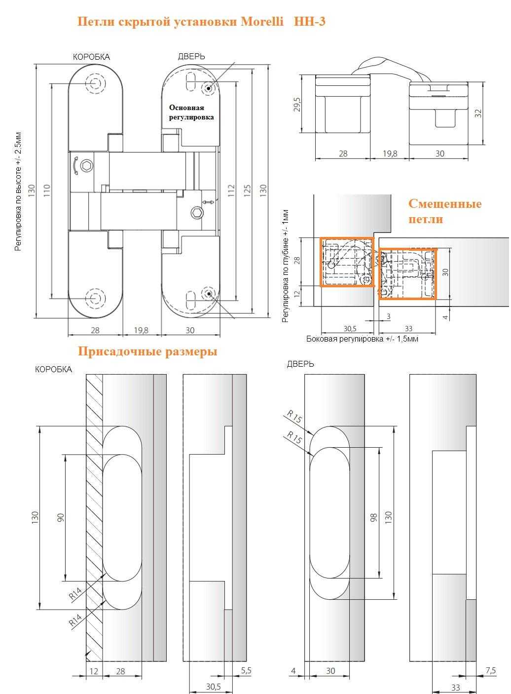 Самой главной особенностью, которой обладают скрытые дверные петли, является невидимость. Поэтому конструкция предусматривает врезание обеих половин изделия в полотно и раму, вхождение движущихся элементов с выемки.