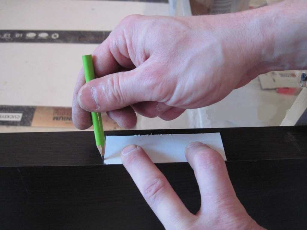 Перед началом важно правильно и точно обвести навес со всех сторон. Далее по этим замерам нужно выполнить углубление, глубиной, равной толщине материала петель