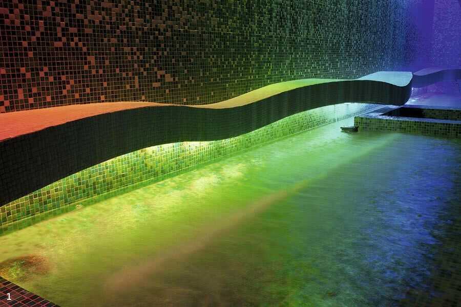 Для создания радужного эффекта отделки купальни потребовалось всего четыре оттенка мозаики и современное осветительное оборудование