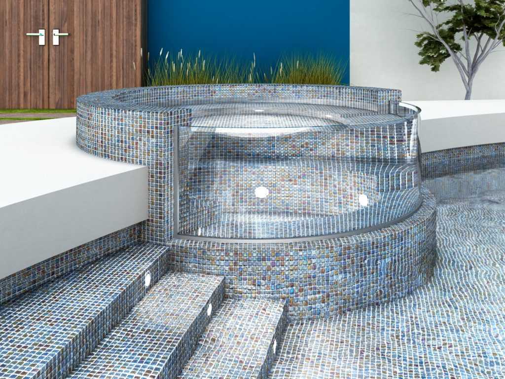 Важное преимущество мозаики — высокая прочность: чем мельче детали, тем меньше риск их растрескивания или раскалывания. Есть и еще один плюс: благодаря малому формату элементов мозаика востребована при облицовке чаш оригинальных, сложных форм с криволинейными стенками