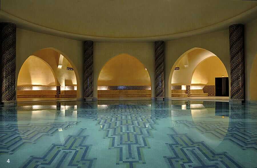 Геометрические мозаичные узоры чаши бассейна повторяются в декоре стен и колонн