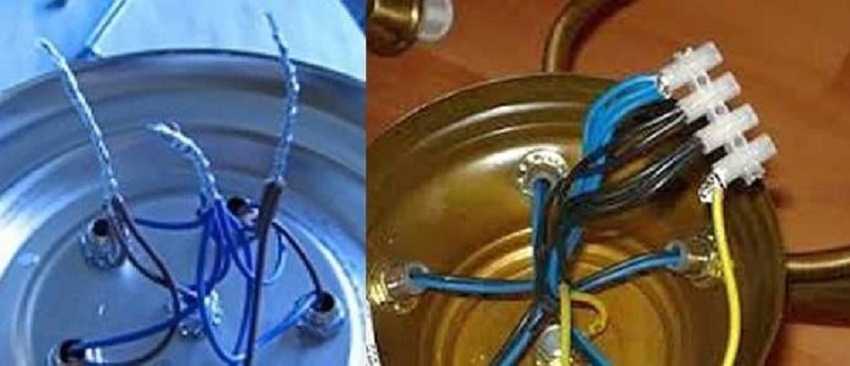 Подключение люстры и прочих приборов освещения выполняется методом опрессовки, спайки или посредством клеммных переходников.