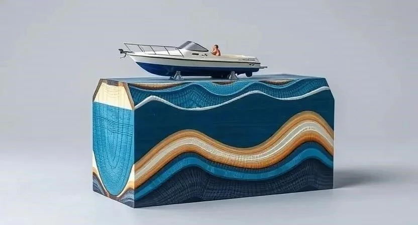 Этот вариант более сложный, но и результат выглядит более эффектно. Суть заключается в создании эффекта воды под лодкой. Для этого необходимо вырезать из фанеры волны и приклеить их к основе подставки.