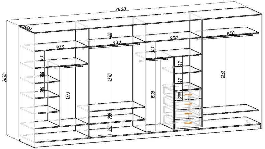 - Составлен чертеж с размерами всех элементов шкафа-купе.
