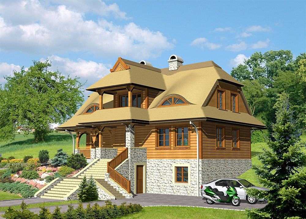 - Проекты коттеджей, где в цокольном этаже расположен гараж, позволяют сэкономить место на участке для дополнительных построек;
