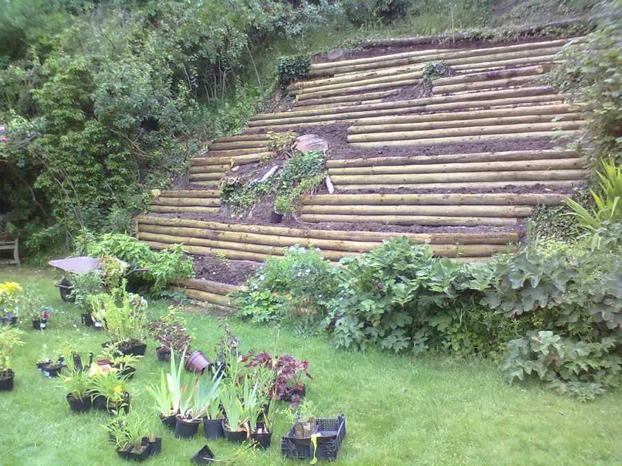 В случае совсем большого уклона необходимо произвести террасирование — разбитие участка на несколько уровней. В основном это осуществляется построением ряда подпорных стенок. Подпорные стены могут появляться из земли, сливаясь постепенно с рельефом. Террасы дают возможность устроить на полученных горизонтальных поверхностях то, что невозможно сделать на склоне, к примеру, детские игровые площади. Да и дорожки, проложенные по прямой поверхности, значительно удобнее!