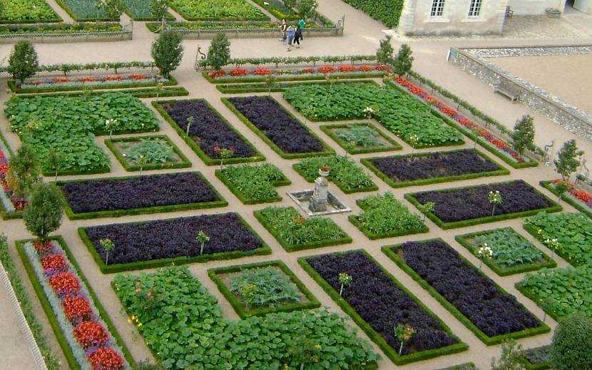 Французский стиль огорода тяготеет к роскоши и изысканным деталям. Внешне дизайн ландшафта напоминает парки Версаля. У композиции есть ядро, от которого отталкиваются остальные модули. Треугольные грядки выстраивают в виде сферы или полукруга. Симметрия просматривается в каждом элементе. Для участка подходят: