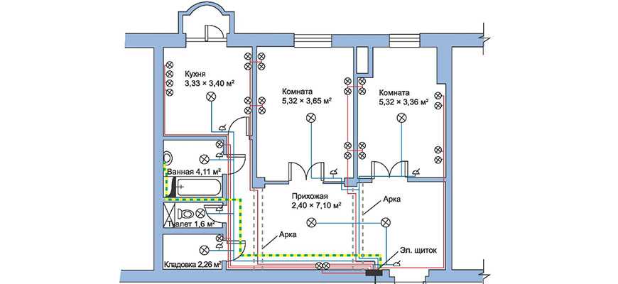 - Электрическую цепь санузла разветвляют с учетом числа помещений.