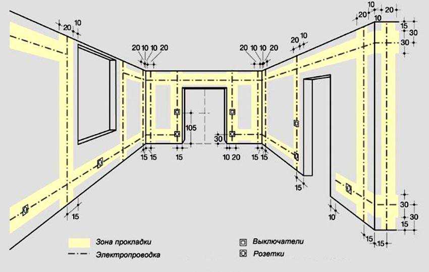 Делая разметку для электропроводки, нужно учитывать наличие обогревательных приборов, высоту потолка, расположение окон или дверей
