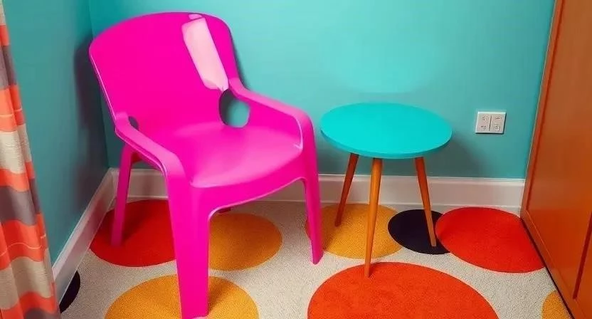 - Мебель: Пластиковая мебель, глянцевые поверхности, необычные формы, яркие цвета