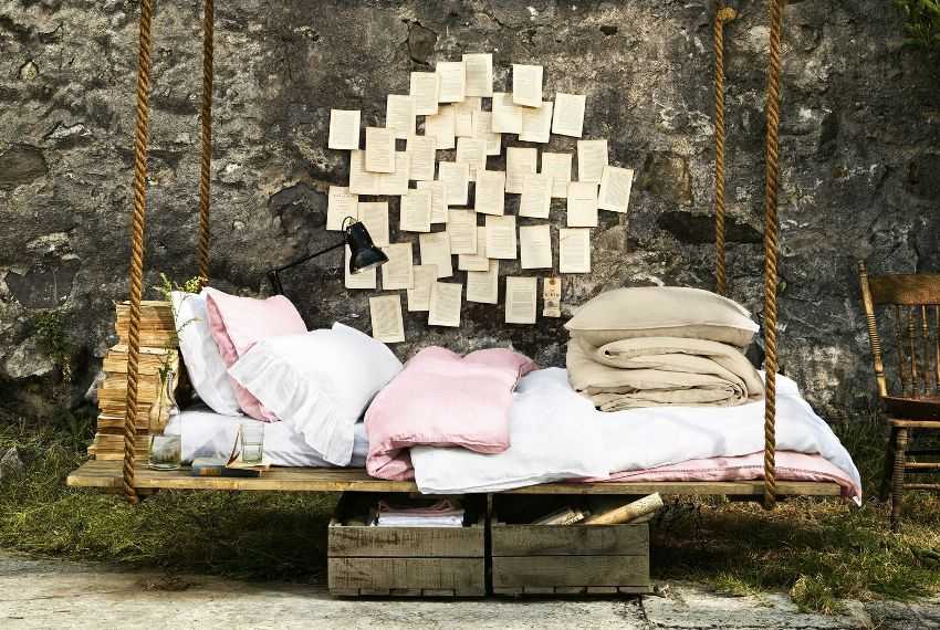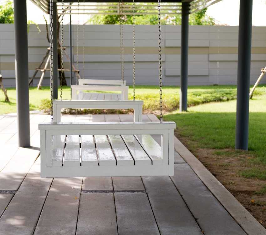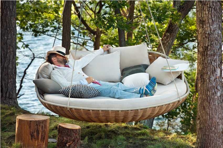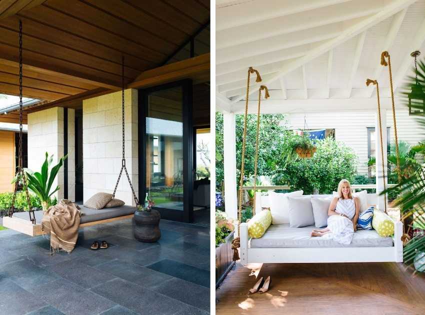 Качели с мягким матрацем и уютными подушками — отличное место для отдыха