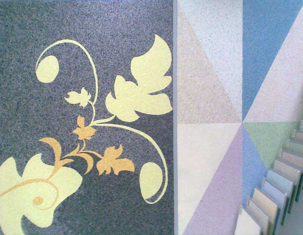 - Благодаря широкому спектру оттенков, материал позволяет производить отделку поверхностей в виде однотонного полотна или рисунка по индивидуальному эскизу, который формируют после нанесения базового покрытия.