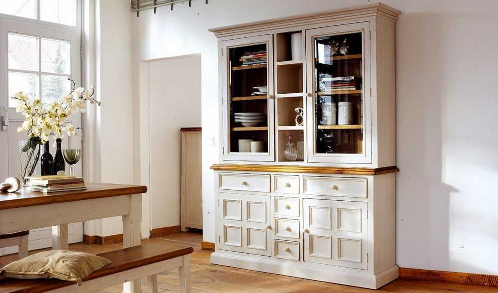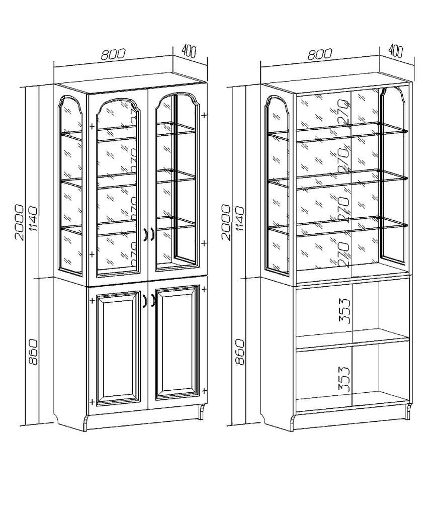 Сам шкаф выполнен в два уровня: нижний, как правило, представляет собой отсек с распашными дверцами и выдвижными ящиками, верхний – витрину или открытые полки. Между отсеками могут быть встроены выдвижные ящики, в которых можно хранить столовые приборы.