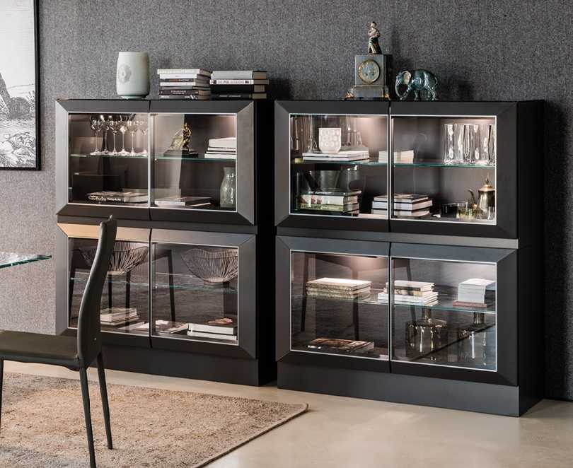 Для придания интерьеру легкости и более эффектной демонстрации содержимого подойдет шкаф-витрина. Это мебель с полностью стеклянными фасадами, часто имеющая зеркальную заднюю стенку. Такой элемент меблировки подчеркнет изысканный вкус хозяев, однако он менее практичен и служит скорее для украшения. Существуют витрины двусторонние, то есть стекло покрывает переднюю и заднюю часть шкафа. Получается обзор содержимого с двух сторон. Их используют для зонирования гостиной, отделения обеденной части от зоны отдыха.
