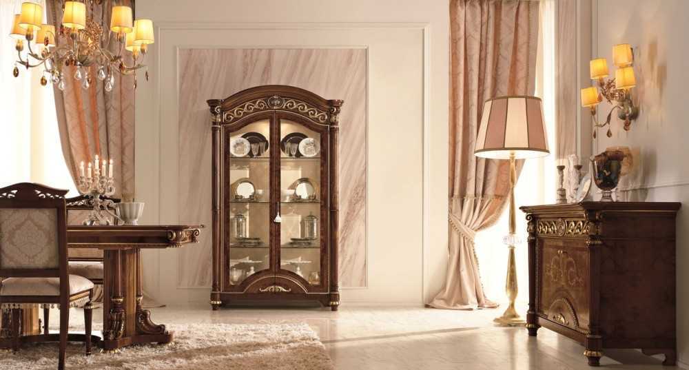 Способ установки зависит от габаритов витрины. Если это узкий шкаф – он удачно впишется в угол. Габаритные модели размещаются вдоль стены, а витрины по типу комодов можно установить в любой точке комнаты.