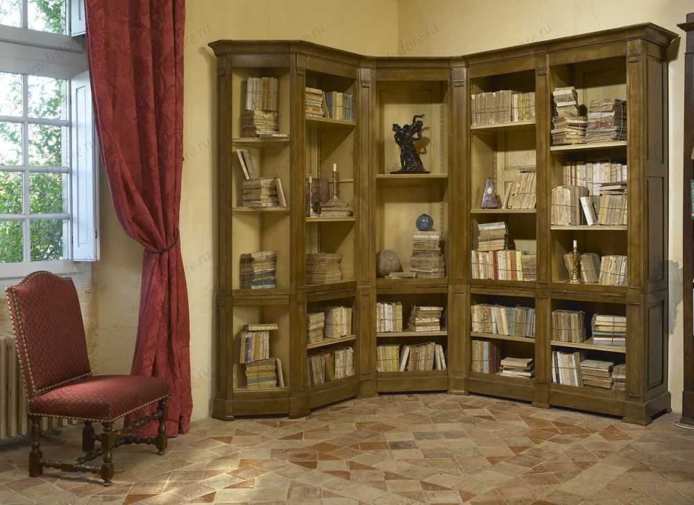 - В комнате есть незанятый угол – угловые модели подойдут идеально. Есть варианты с прямым или гнутым фасадом, различным количеством и высотой полок и так далее. ·
