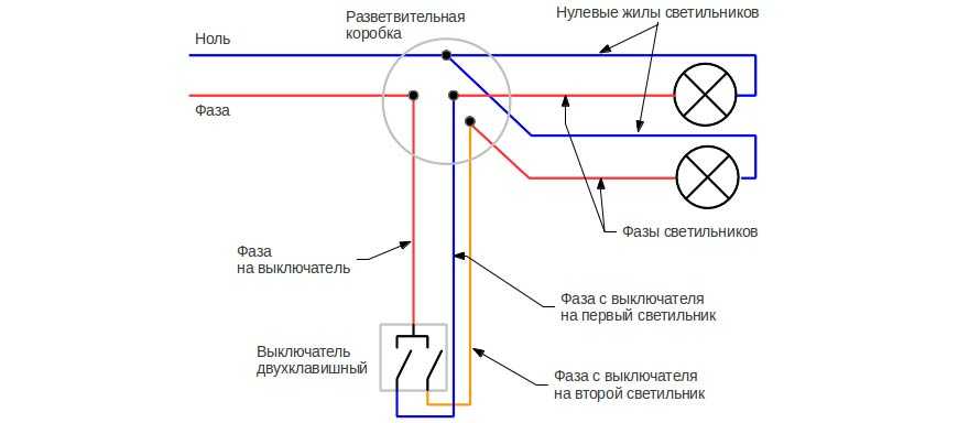 Ниже мы приводим схему соединения всех элементов электрической цепочки управления освещением в распределительной коробке.