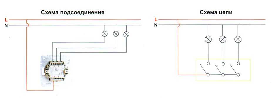Трехклавишный выключатель может включить трехсветную люстру как единое целое, но только все лампочки вместе или по отдельности, как это вам захочется. Схема сможет работать и при установке на выключатель нулевого провода, однако правильнее и безопаснее установить его на фазу в разрыве. В противном случае осветительный прибор всегда будет оставаться под напряжением, вызывая риск поражения током, при замене лампочек. Входной фазный L подключается со стороны одиночной клеммы, а выходные фазные L1.