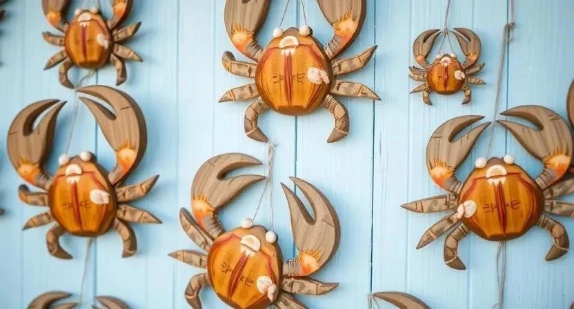 Крабы отлично сочетаются с другими морскими элементами декора, такими как ракушки, морские звезды, якоря и канаты. Можно использовать различные цветовые решения: