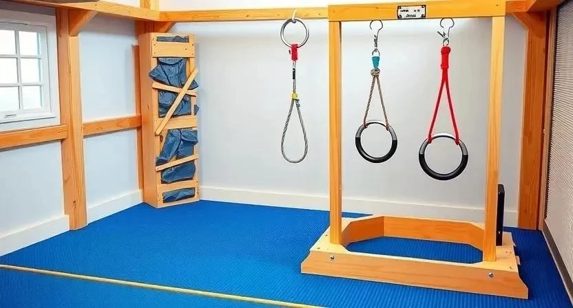 - Для просторной комнаты: Шведская стенка, турник, кольца, канат, горка, батут, лазалка.