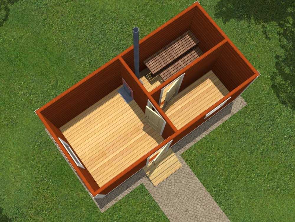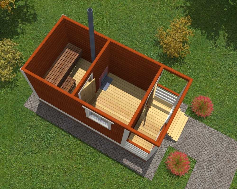 Мини-баня на загородном участке — прекрасный вариант для экономии площади. Правда, одновременно попариться в помещении 3х3 или 3х4 получится лишь у пары человек. Тем не менее, это самый быстрый и недорогой вариант постройки. За основу проще всего взять готовый проект каркасной бани. Можно объединить раздевалку, душевую и парилку в одном помещении. Или предусмотреть более удобный проект с отдельной парилкой, помывочной и комнатой отдыха.