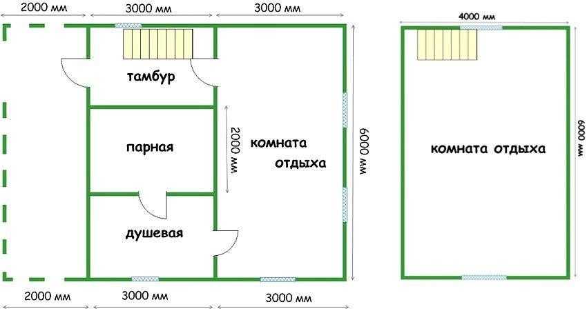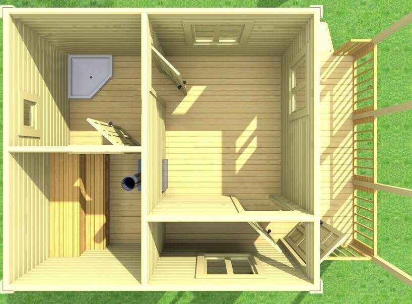 В последнее время при возведении бань парную отделяют от моечной, выбирая планировку из трех помещений. В этом случае размеры строения должны быть 4х4 или 6х4.