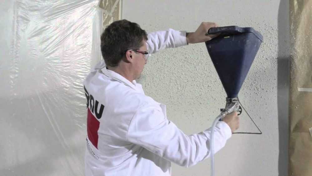 Перед разбрызгиванием намочите стену и при помощи пульверизатора нанесите на поверхность. Слой не должен превышать пол сантиметра для бетона.