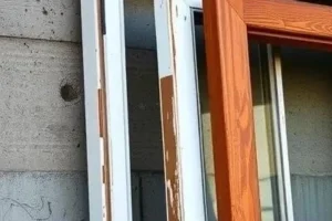 - Зафиксируйте угловой профиль. На пол либо подоконник положите прямоугольный треугольник, сбитый из реек (длина его катета должна быть немного больше ширины откоса). Одним из катетов треугольник прижмите к горизонтальному брусу коробки/рамы, а другой — к передней части углового профиля.
