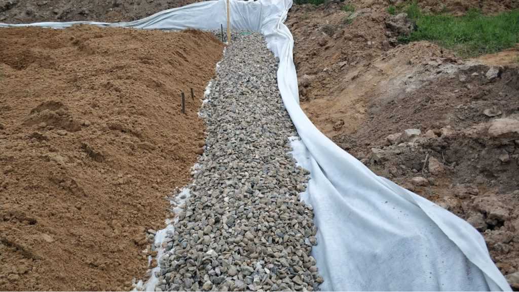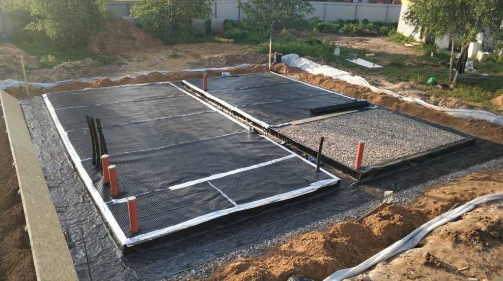 Дренажная труба укладывается в щебень, который обернут геотекстилем высокой плотностиСмотровые колодцы дренажной системы устанавливаются по уровню После монтажа закладных и дренажа делаем подушку из крупнозернистого песка с проливкой и послойным уплотнениемВерхний слой подушки устраивается из гравийного щебня