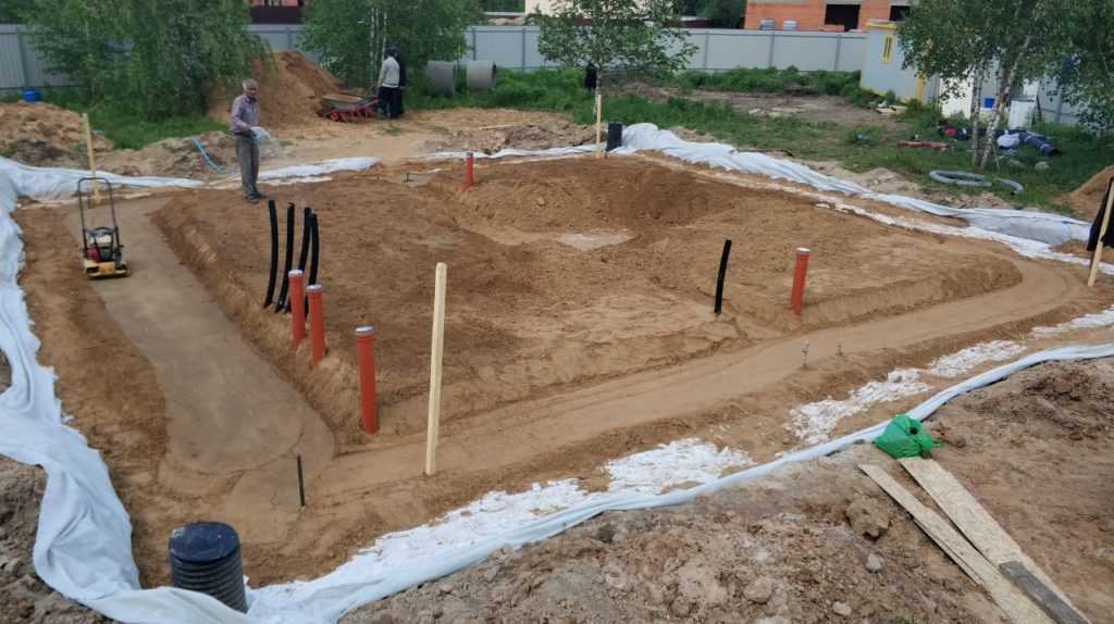 Монтаж закладных под коммуникации и установка кольцевого дренажа по периметру фундамента Дренажная труба укладывается в щебень, который обернут геотекстилем высокой плотностиСмотровые колодцы дренажной системы устанавливаются по уровню