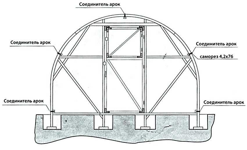 В торце каркаса из труб собирается дверной проем — он выглядит как П-образная конструкция. Она крепится на трубу основания и фиксируется сверху на торцевой дугообразной трубе. Дверь собирается согласно чертежу из четырех отрезков труб.