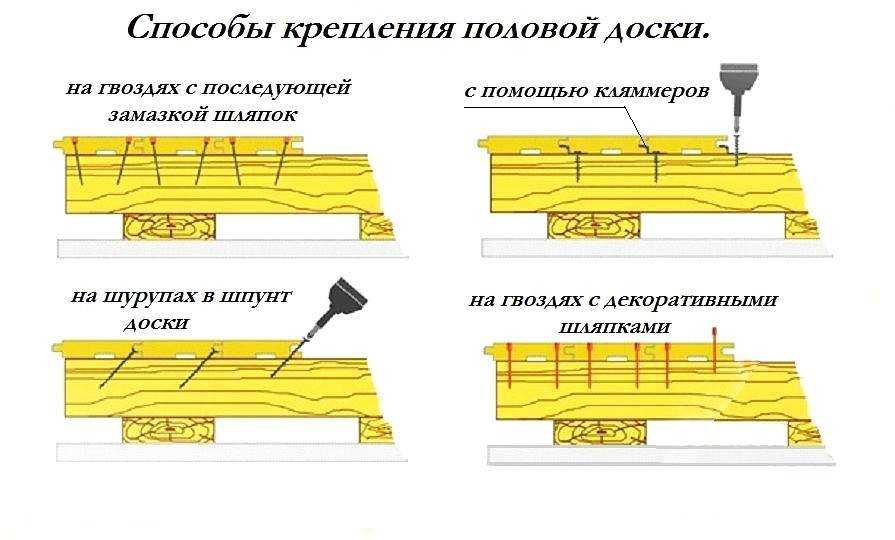 Наиболее популярный способ крепления – с помощью саморезов для крепления половых досок. Этот метод отличается высокой скоростью исполнения и долговечностью готовой конструкции.