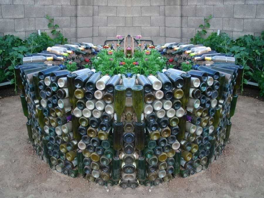 Технология укладки ограждения выглядит так же, как и из пластиковых бутылок. То есть, копается неглубокая траншея, в которую вверх или вниз горлышком устанавливается стеклянная тара и присыпается землей. Чтобы придать клумбе особый шарм, бутылки закрываются одинаковыми пробками и устанавливаются горлышком вверх под уклоном. Сверху горлышки можно обвязать яркими нитками, разноцветной проволокой. Для сооружения заборчика средних размеров понадобится до 25 бутылок. Такие сооружения обычно используются садоводами при обустройстве цветников с низкорослыми растениями.