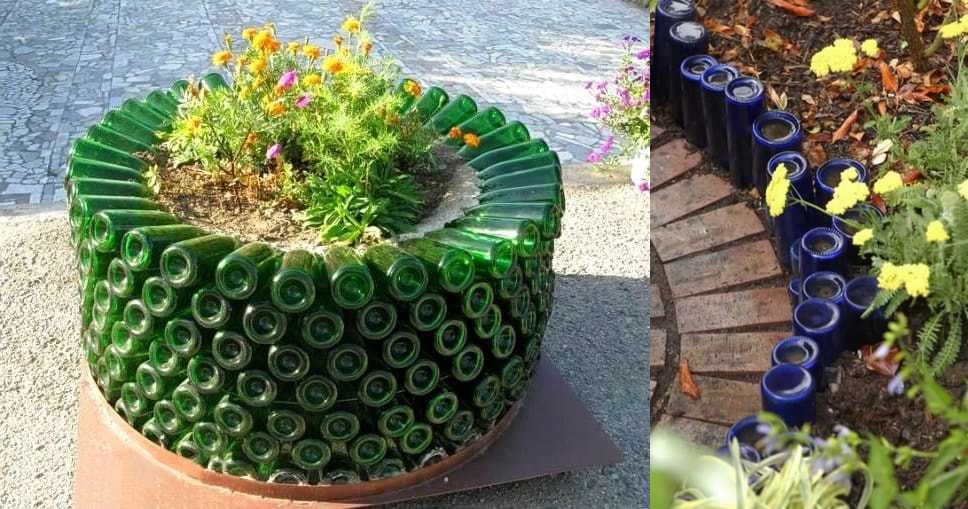 Оградка из стеклянных бутылок — долговечны, и прекрасно смотрятся при соседстве с невысокими растениями.