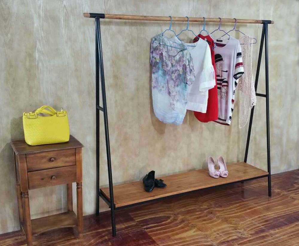 Часто в мебельных супермаркетах представлены образцы с металлической стойкой, установленной на деревянную опору-крестовину или имеющую в верхней части деревянные крестообразные консольные поперечины, где удобно развесить как просто одежду, используя закрепленные крючки, так пиджаки, плащи или куртки на плечиках.