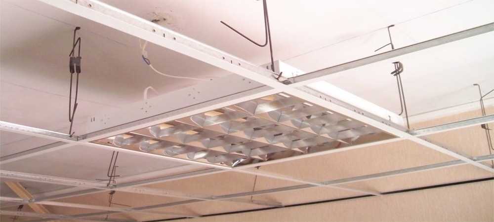 - Затем формируют каркас подвесной системы, закрепляя несущие профили с помощью специальных монтажных планок.