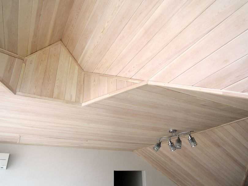 Интересный момент в бунгало — необычная пологая крыша. Внутри ее тоже можно обшить фальшбрусом.
