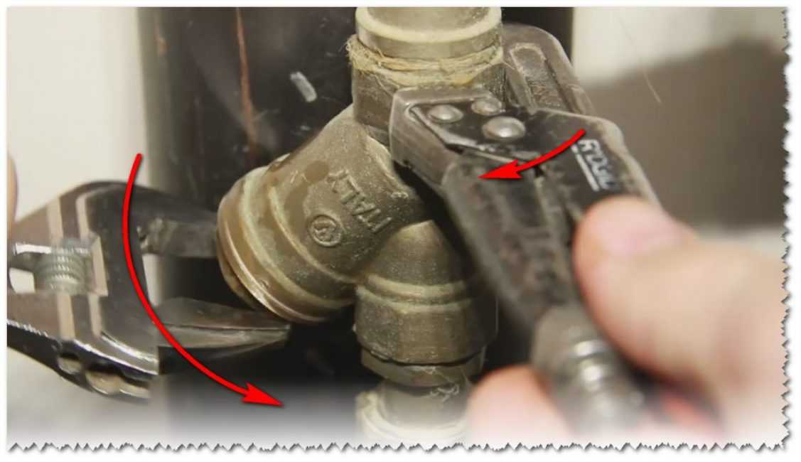 Установив ключи на гайки, как показано на рисунке, основное усилие придаём ключу, откручивающему гайку фильтра, вторым не даём трубе повернуться.