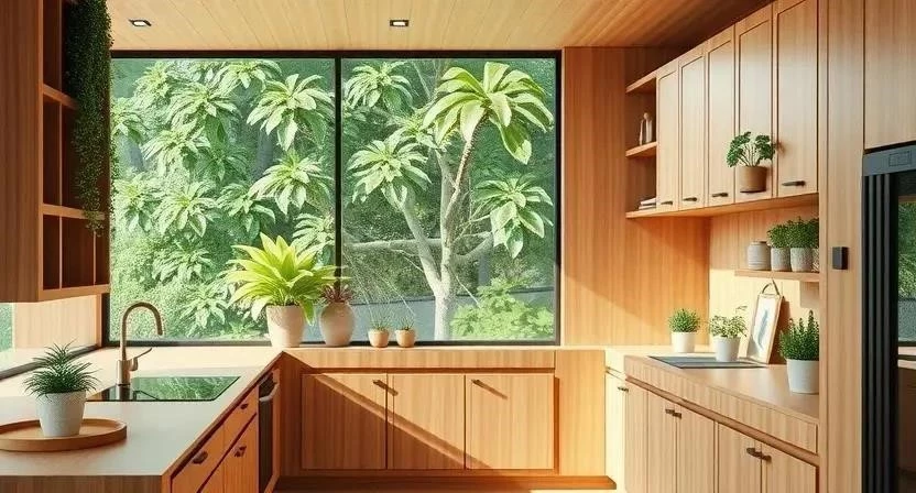 - Кухня: Добавьте зелень, используйте деревянную мебель и натуральные материалы для отделки.