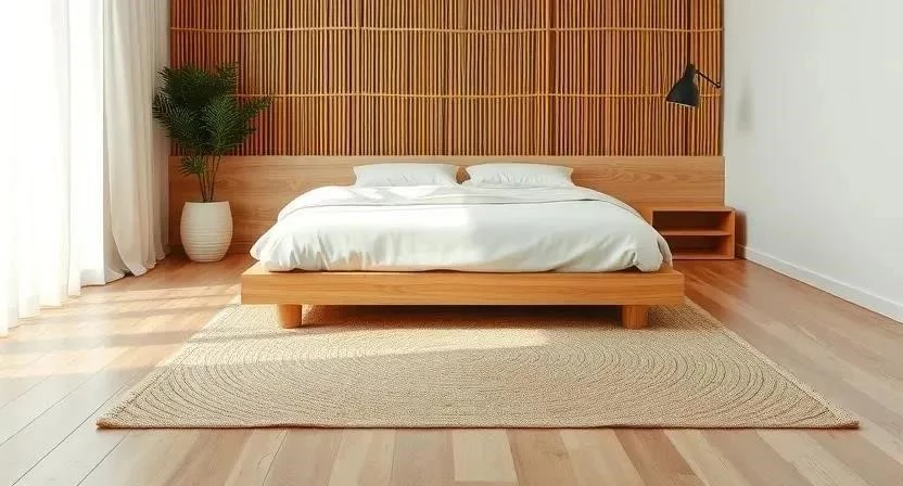 Как зонировать спальню в стиле биофилия? Используйте деревянные перегородки, растения или ковры для зонирования пространства.