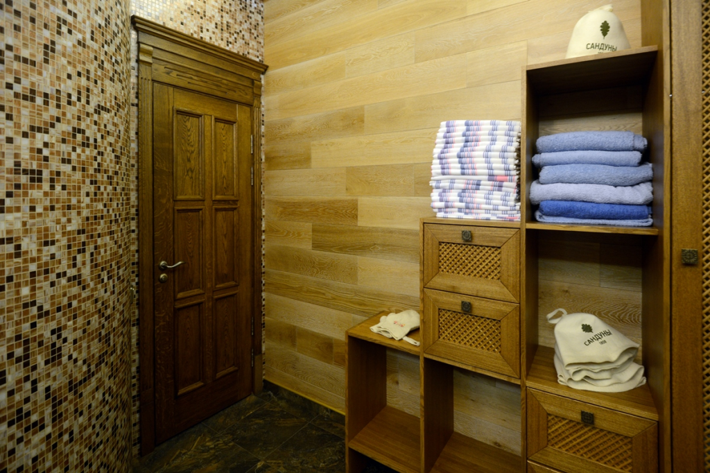 Традиционно в банях использовалось именно дерево. Пол, стены, потолок — все деревянное, двери тоже. Вам могут предоставить несколько вариантов: