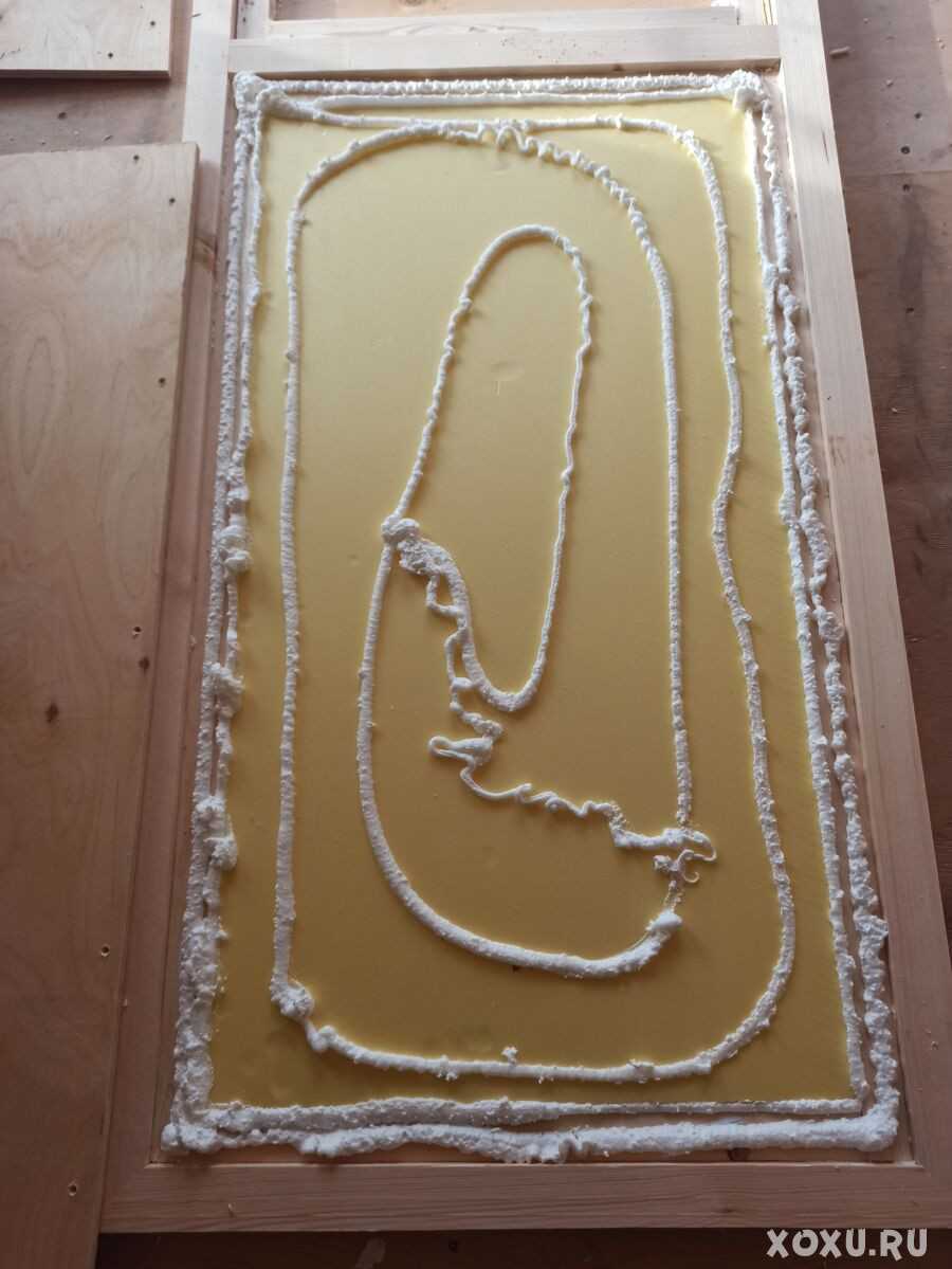 Прикладываем вторую часть фанеры, прямо на пену. Это и склеит двери, и всё будет идеально: