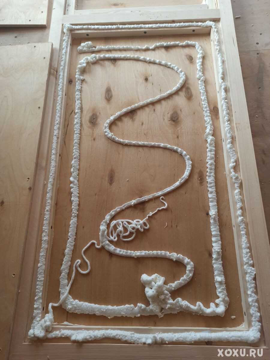 Укладываем ПЕНОПЛЭКС внутрь рамки на одну часть прикрученной фанеры (то есть, перевернули двери). Пропениваем все щели, и наносим пену снаружи…