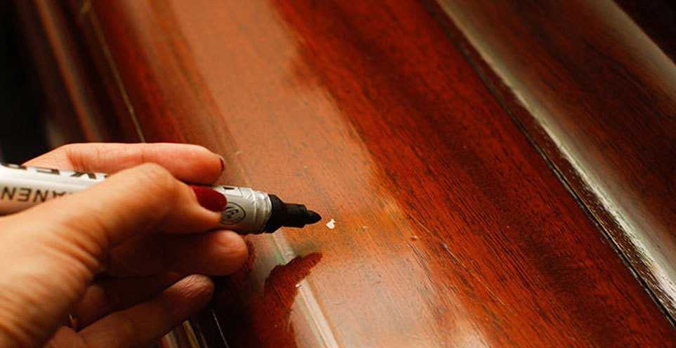 Используется для маскировки небольших царапин. Представляет собой тюбик, который закрывается крышечкой с кистью, наподобие лака для ногтей. Наносится в один или несколько слоев до полного устранения дефекта. Излишки удаляются краем пластиковой карты, а сама поверхность полируется войлоком или мягкой тканью. Идеальный цвет подобрать сложно, поэтому можно дорисовать недостающую фактуру обычным фломастером и покрыть мебельным лаком. Для этой цели лучше использовать лак в виде спрея. Он наносится равномерно и не оставляет видимого края нанесения состава.