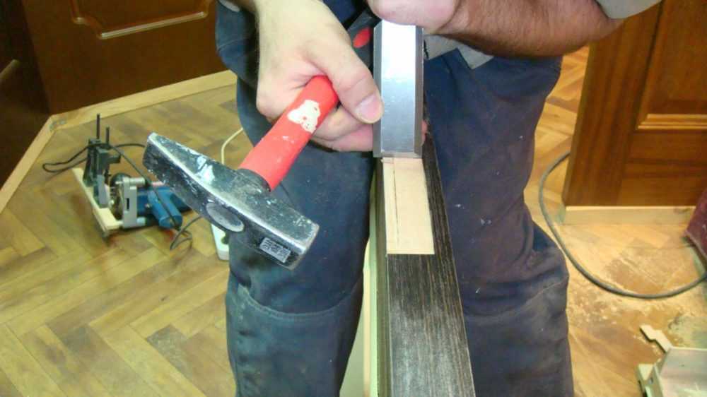 Следующим шагом является вырезание выемки на коробе и торце полотна по размеру в толщину петли. Это возможно осуществить специальным оборудованием: стамеской либо фрезой.