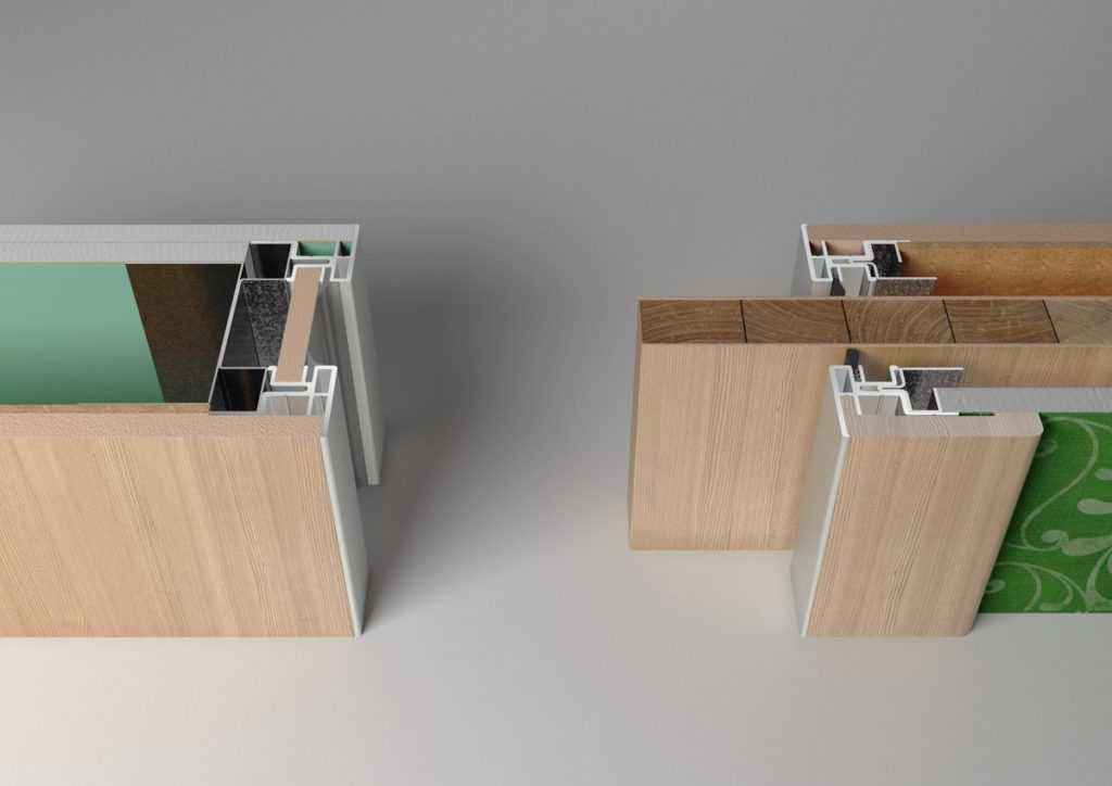 Если для скрытой двери планируется встраиваемая ниша, тогда удаляется часть стены, и используются 2 ряда опорных профилей. Если планируется обустройство кассеты вдоль стеновой поверхности, тогда достаточно 1 ряда опор. Перемычки с рельсовыми направляющими крепятся в первую очередь. Под ролики прокладывают резиновые ленты, чтобы дверные панели открывались бесшумно.