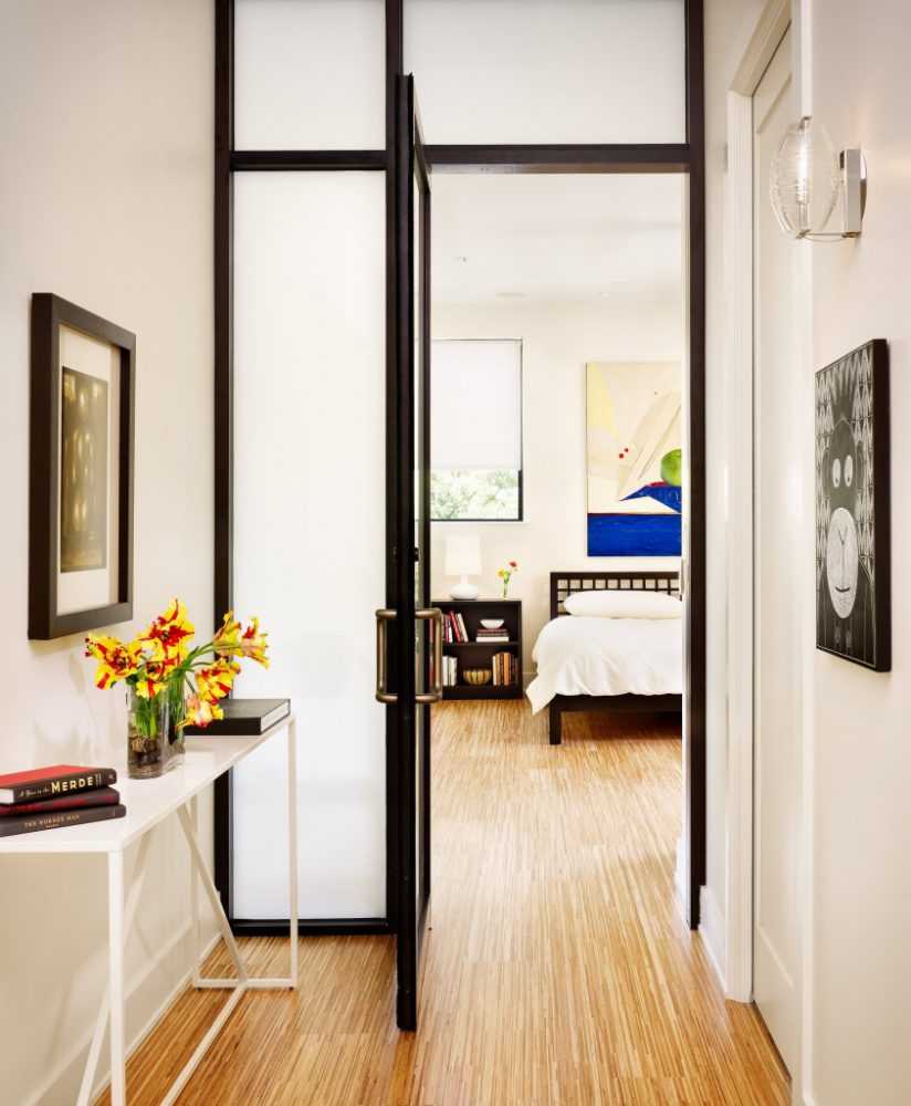 Стеклянная дверь хорошо пропускает дневной свет, поэтому ее лучше использовать для дополнительного освещения темных помещений, например, дверь из кухни в темный коридор. Вставка из закаленного стекла, которое при разбитии распадается на мелкие кусочки, практически исключает травмы от порезов.