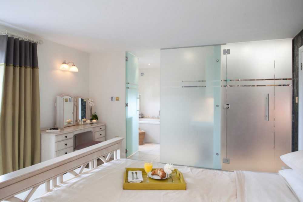 Купейные полотна, украшенные стеклянными элементами, привносящими в помещение больше дополнительного света, особенно часто используются в оформлении спальни.