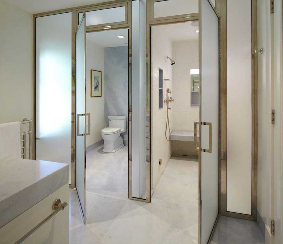 Светлое оформление ванной комнаты небольшого размера с дверями из матового стекла